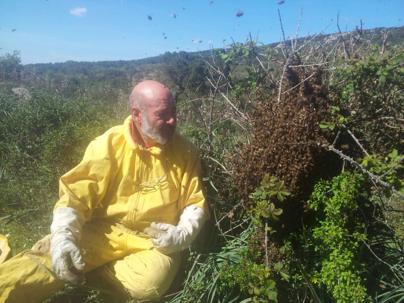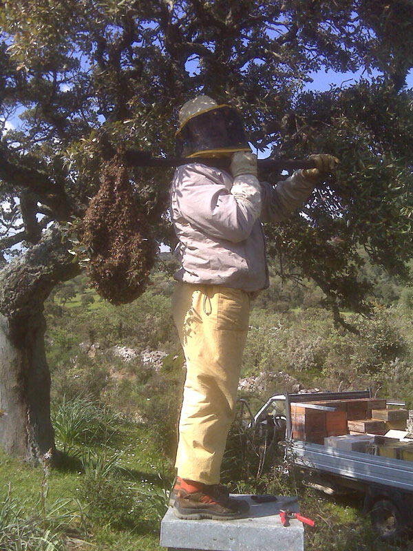 FILIPPO CORVEDDU alle prese con il recupero di uno sciame appeso su una quercia da sughero.