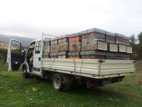 IN QUESTO CASO UN CARICO DI ARNIE POPOLATE E' PRONTO PER ESSERE TRASPORTATO IN UNA POSTAZIONE RICCA DI CORBEZZOLI, PER LA PRODUZIONE DEL MIELE AMARO. |
